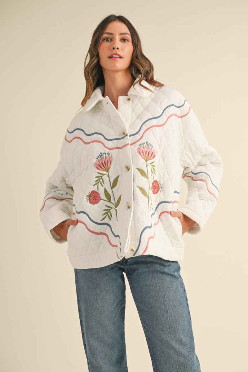 This quilted jacket feels like a soft nod to vintage French florals with a modern, everyday ease. Designed in a creamy neutral with multicolor embroidered details and subtle wave accents, it brings charm, texture, and warmth without feeling heavy. An effortless layering piece that elevates denim and basics instantly.