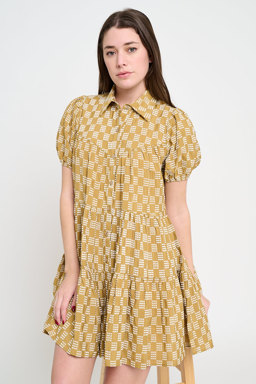The Terracotta Weave Button Down Dress brings easy charm and texture to your everyday wardrobe. Designed in a relaxed babydoll silhouette, it features short puff sleeves, a collared neckline, and a soft checkerboard weave that adds visual interest. The tiered shape offers effortless movement, while the warm terracotta hue pairs perfectly with everything from white sneakers to fall boots.