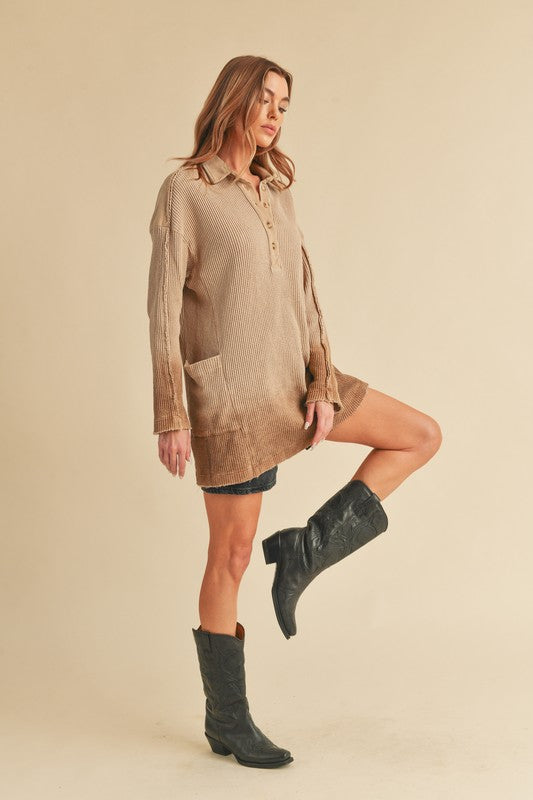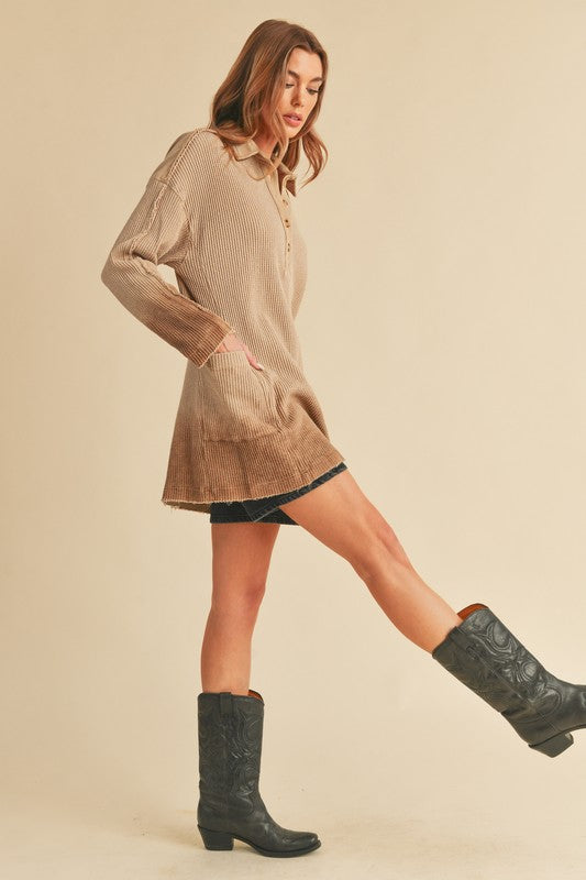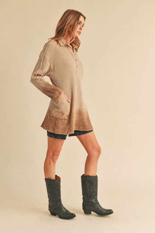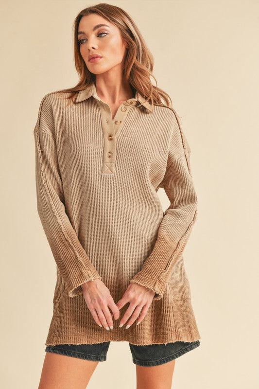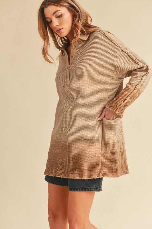 Unwind in elevated comfort with the Urban Retreat Waffle Knit Top. This oversized, slouchy button-front style is crafted from soft 100% cotton waffle knit and finished with contrast back piecing and an ombré wash along the hem for subtle dimension. Dropped shoulders, a classic collar, and side pockets add everyday ease, while defined seaming creates a long, flattering line. Lightweight yet cozy, it’s the statement layer your casual-chic wardrobe deserves.