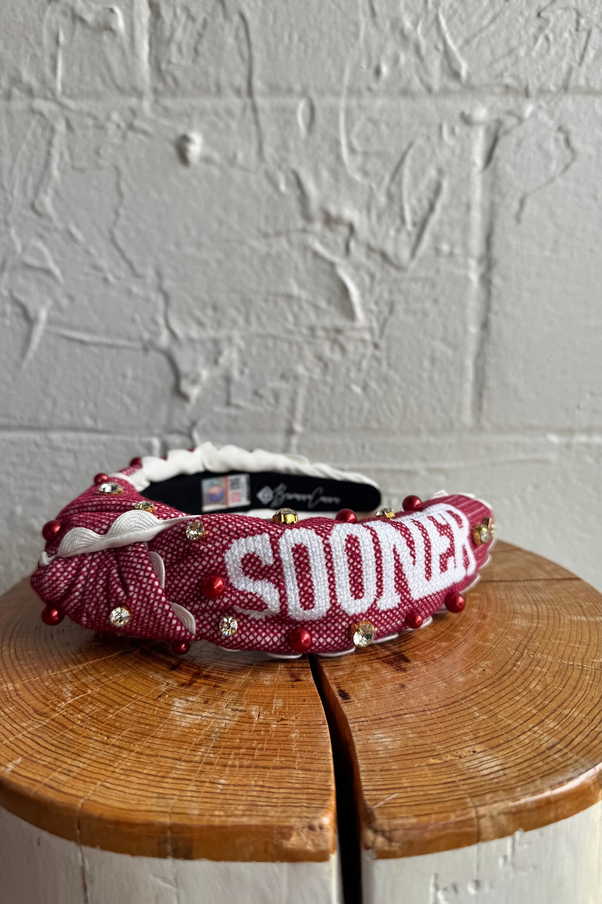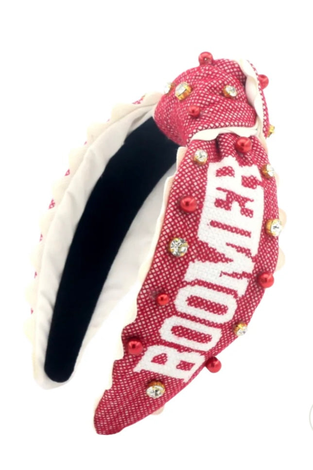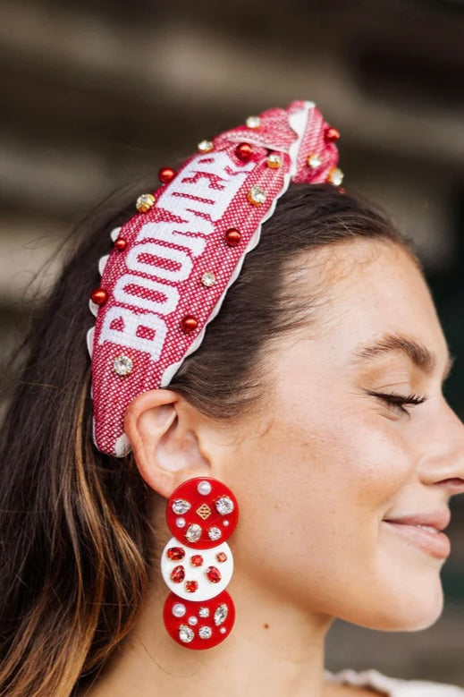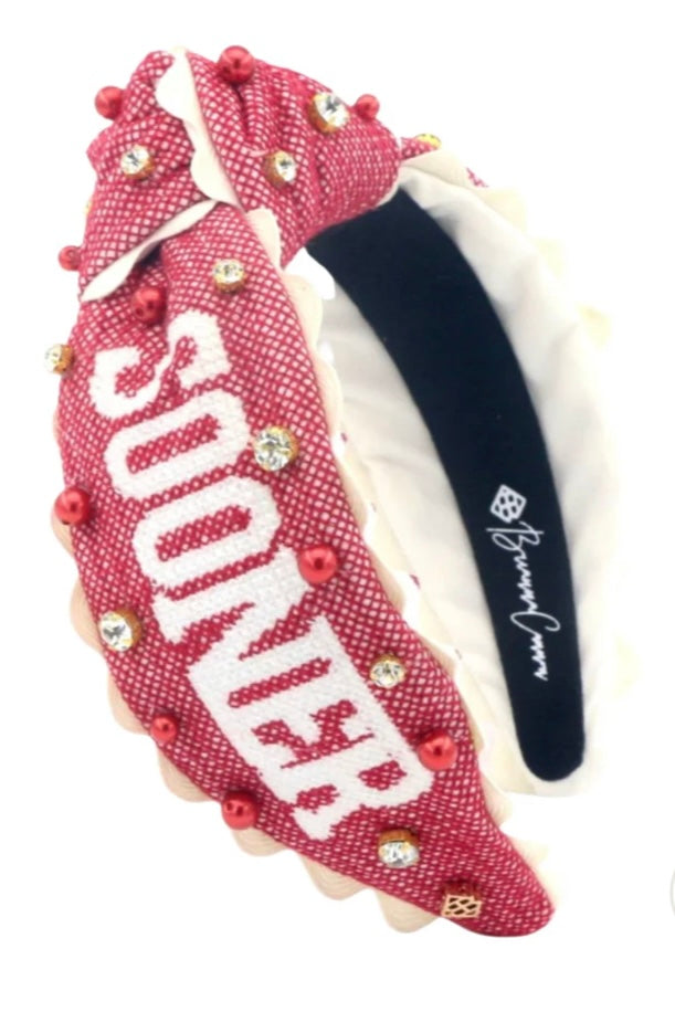 Cheer loud and proud with the Brianna Cannon BOOMER / SOONER Cross Stitch Headband—officially licensed and made to dazzle. One side says BOOMER, the other says SOONER, both adorned with crystal and pearl embellishments that bring serious sparkle to your sideline style.