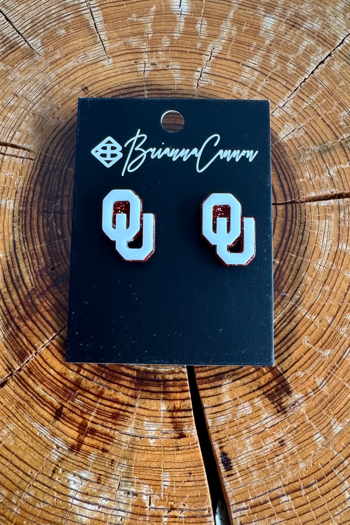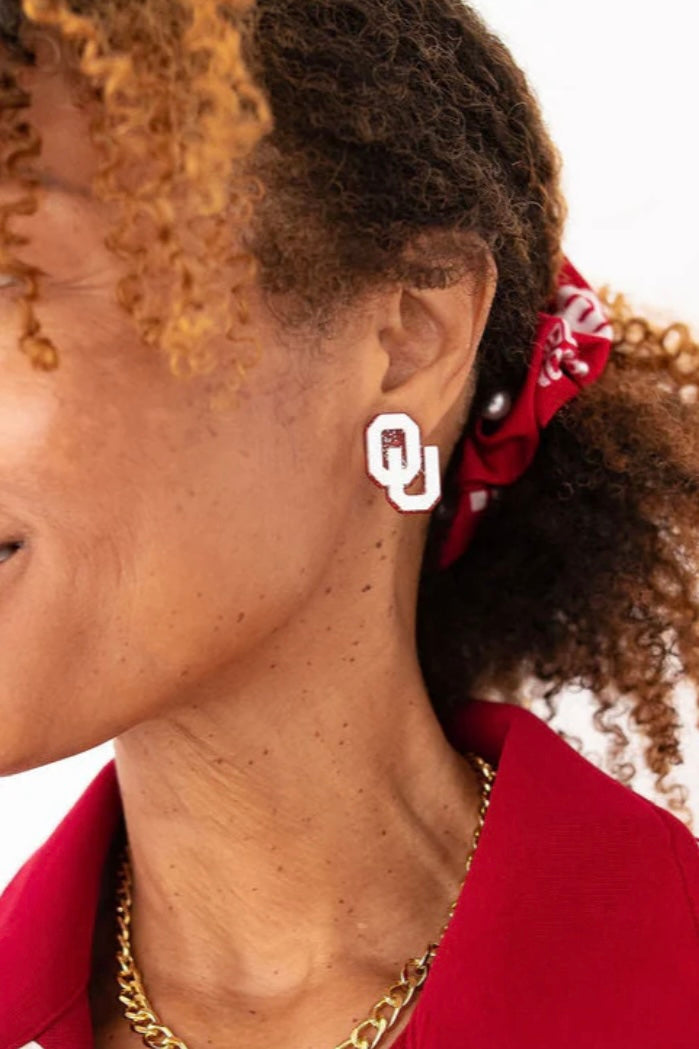 Add a little sparkle to your Sooner spirit with the OU White & Crimson Glitter Logo Studs by Brianna Cannon. Featuring a bold interlocking OU logo in white acrylic with crimson glitter fill, these officially licensed studs are perfect for game days in Norman or everyday Oklahoma pride.