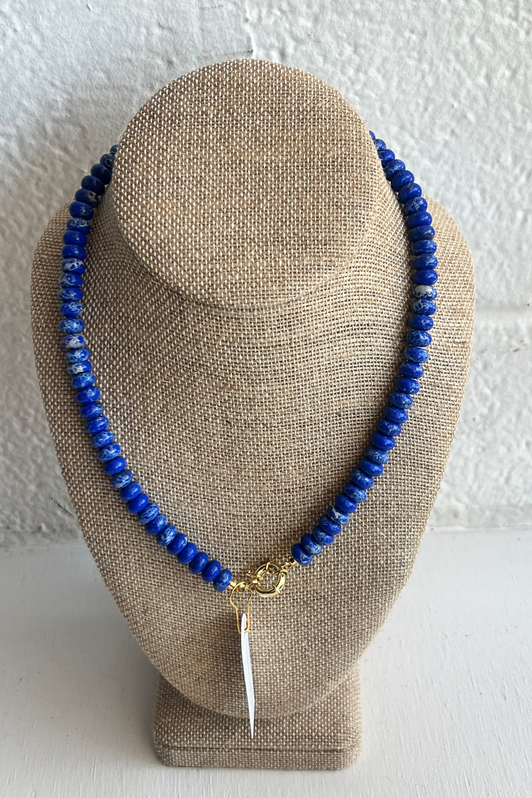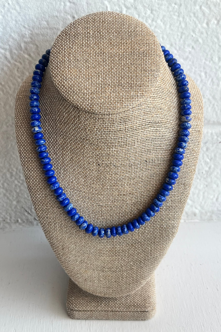 Bold and timeless, the Candy Necklace in Royal Blue Jasper delivers instant impact. Hand-strung with rich cobalt gemstone beads and finished with an 18kt gold-plated clasp, this 17-inch strand is handcrafted in Charleston, SC. It’s the ultimate cool-toned staple that stands alone or layers like a pro.