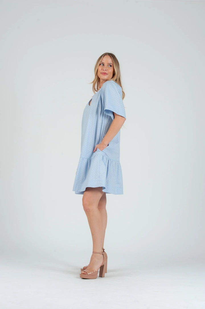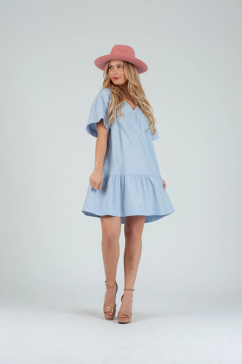 Introducing the Paradise Poplin Dress! Flattering fit, V-neck, and pleated puff sleeves make it stylish. The drop waist  adds a playful touch. A dress that's paradise for your wardrobe!