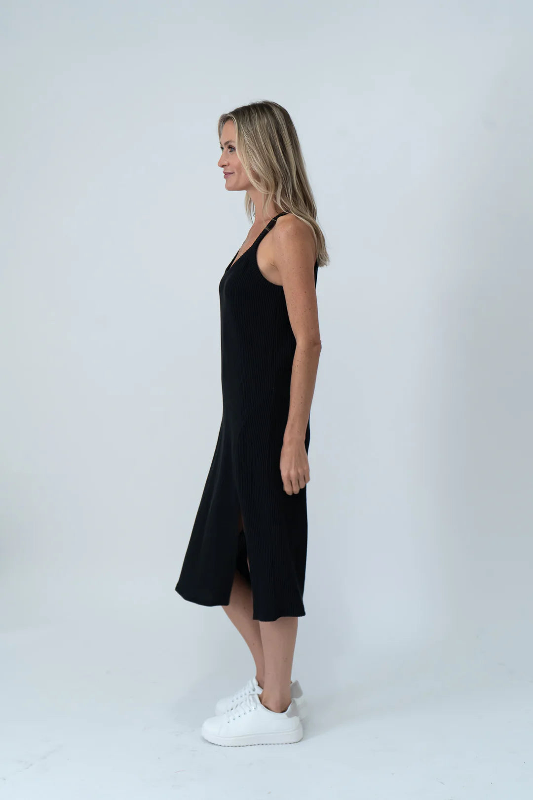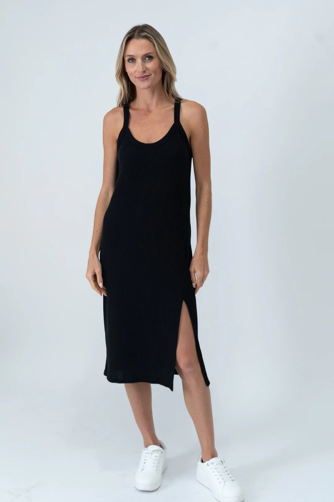 A throw-on-and-go favorite with elevated texture. The Brenna Urban Rib Tank Dress by Six Fifty is breathable, soft, and ultra-stretchy with a scrunched ribbed finish that adds modern edge. The relaxed midi length and scoop neckline keep things classic, while the side slit brings just enough sass. An easy essential that transitions effortlessly from day to night.