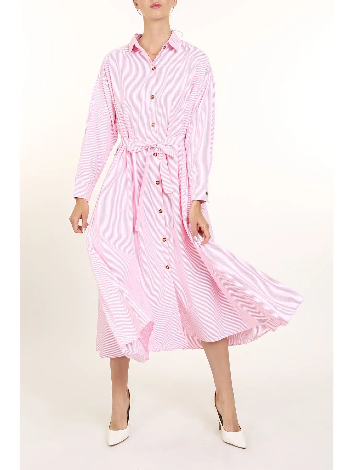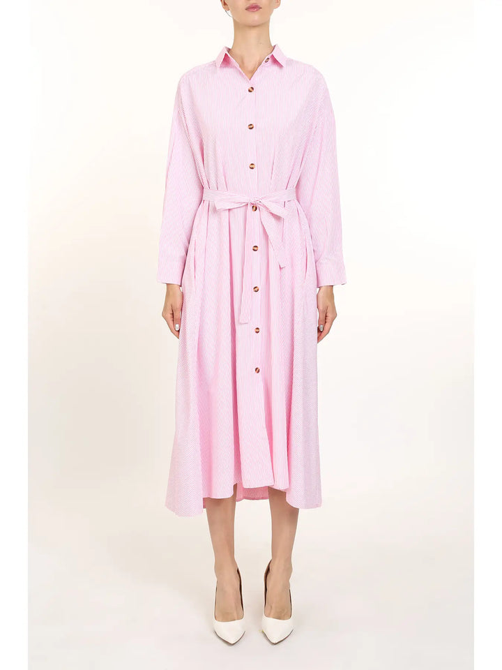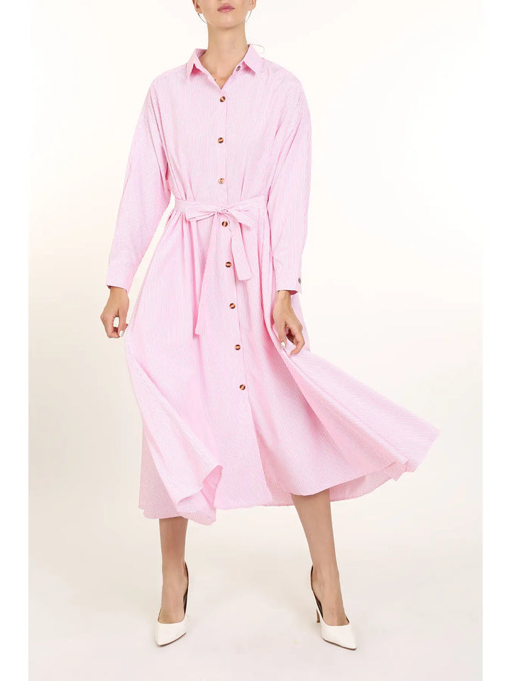 Clean lines, classic charm. The Briar Dress is your everyday essential elevated with subtle stripe detail and a flowy A-line shape. Featuring long bishop sleeves, a button front, and a matching waist tie, this cotton-blend midi brings polish to anything from errands to office days. Wear it belted or loose—either way, it’s an easy win.