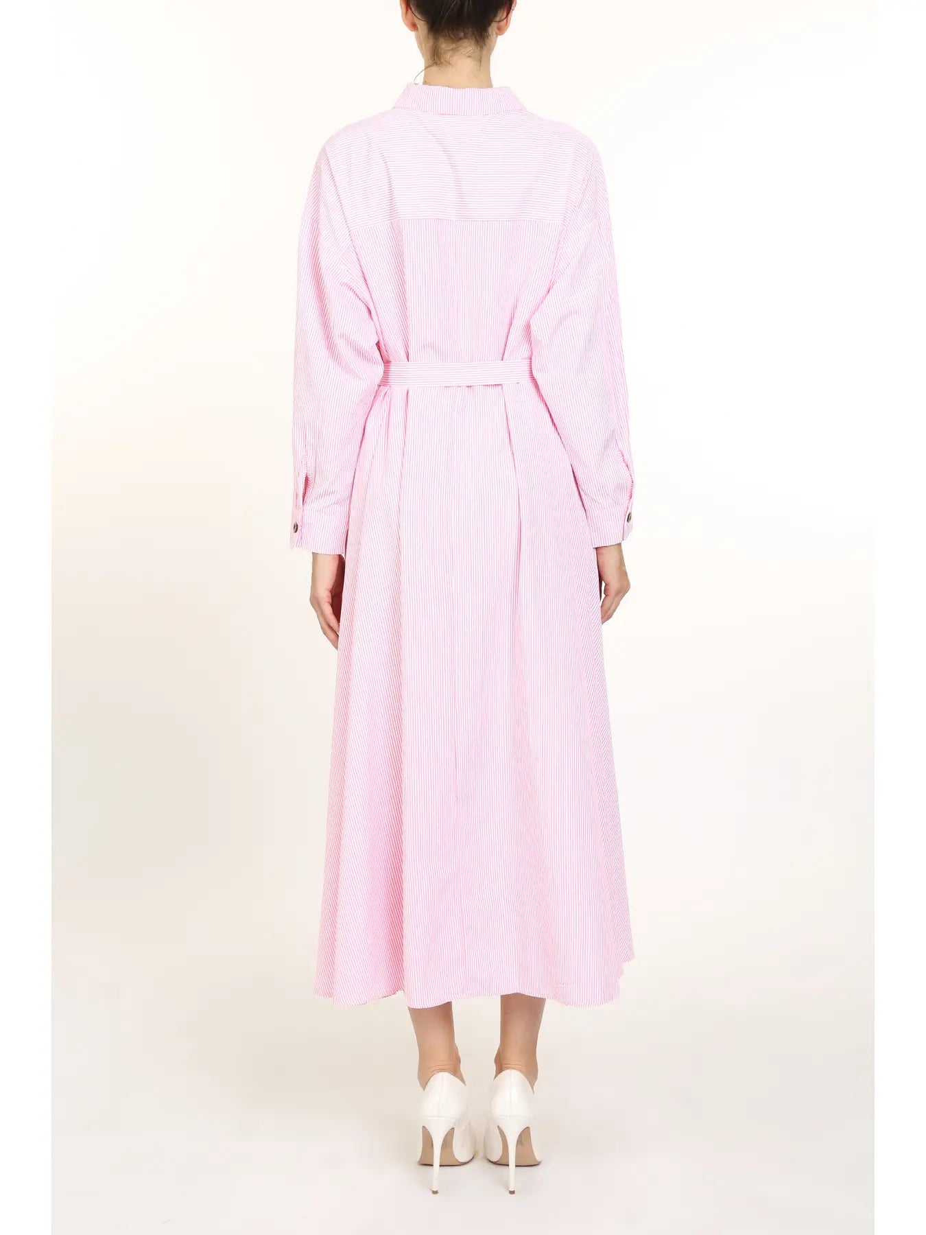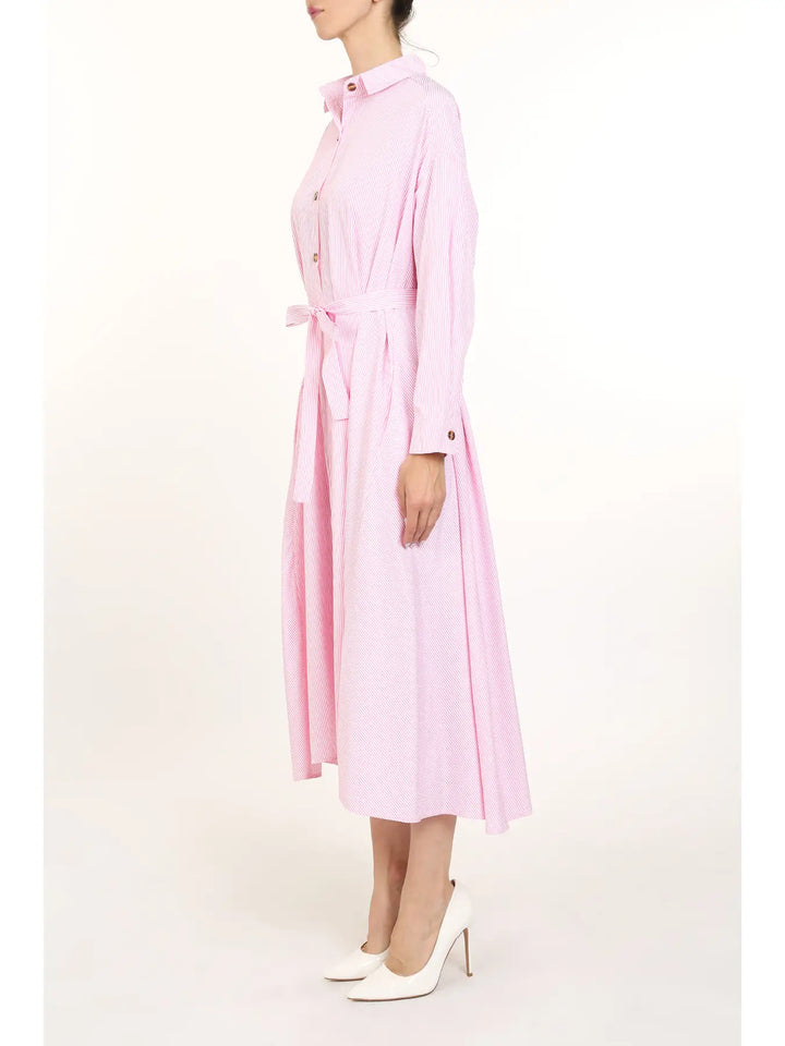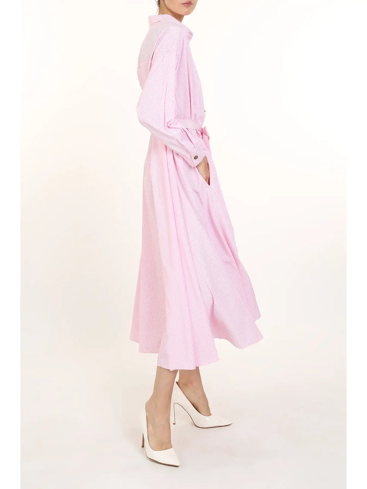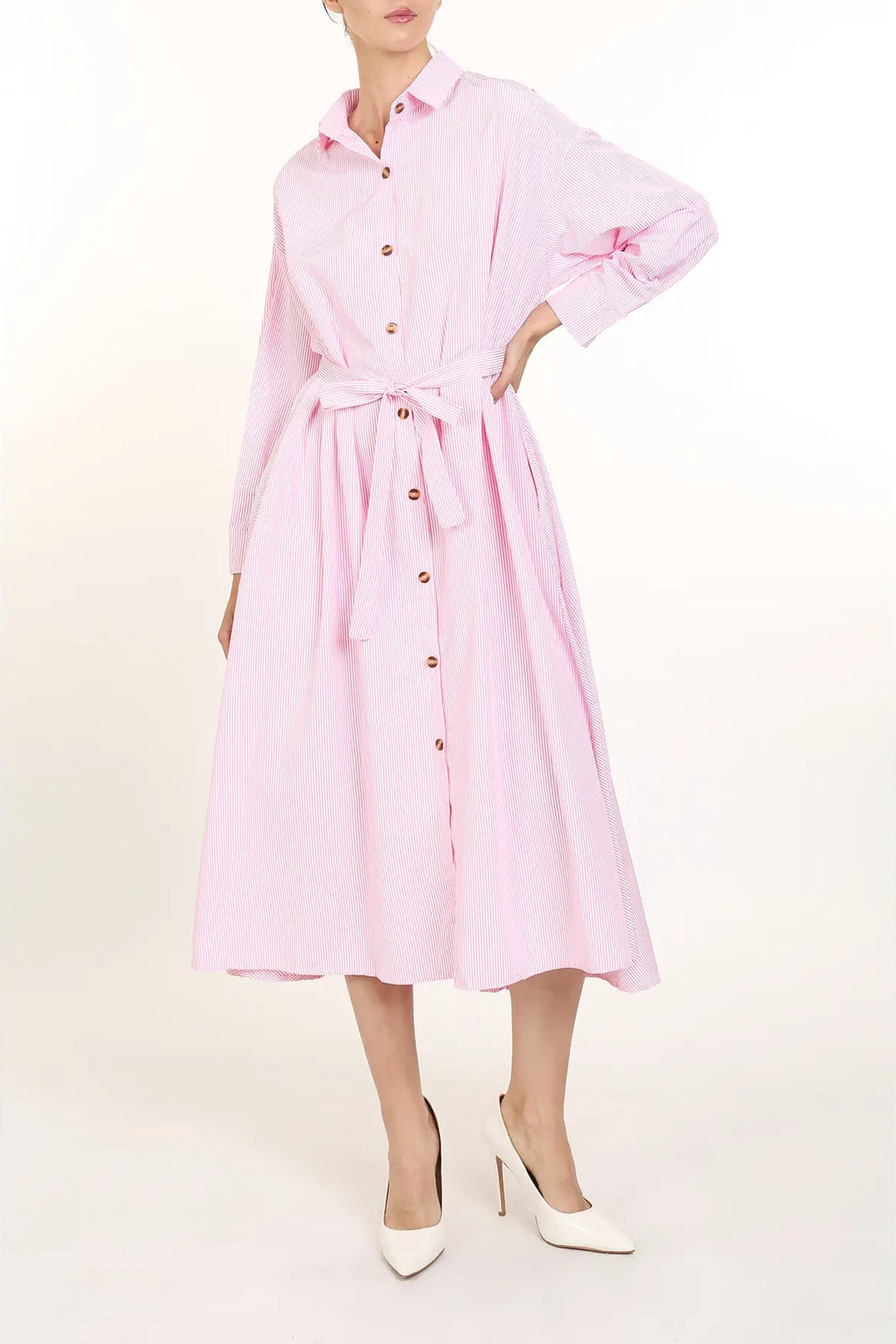 Clean lines, classic charm. The Briar Dress is your everyday essential elevated with subtle stripe detail and a flowy A-line shape. Featuring long bishop sleeves, a button front, and a matching waist tie, this cotton-blend midi brings polish to anything from errands to office days. Wear it belted or loose—either way, it’s an easy win.