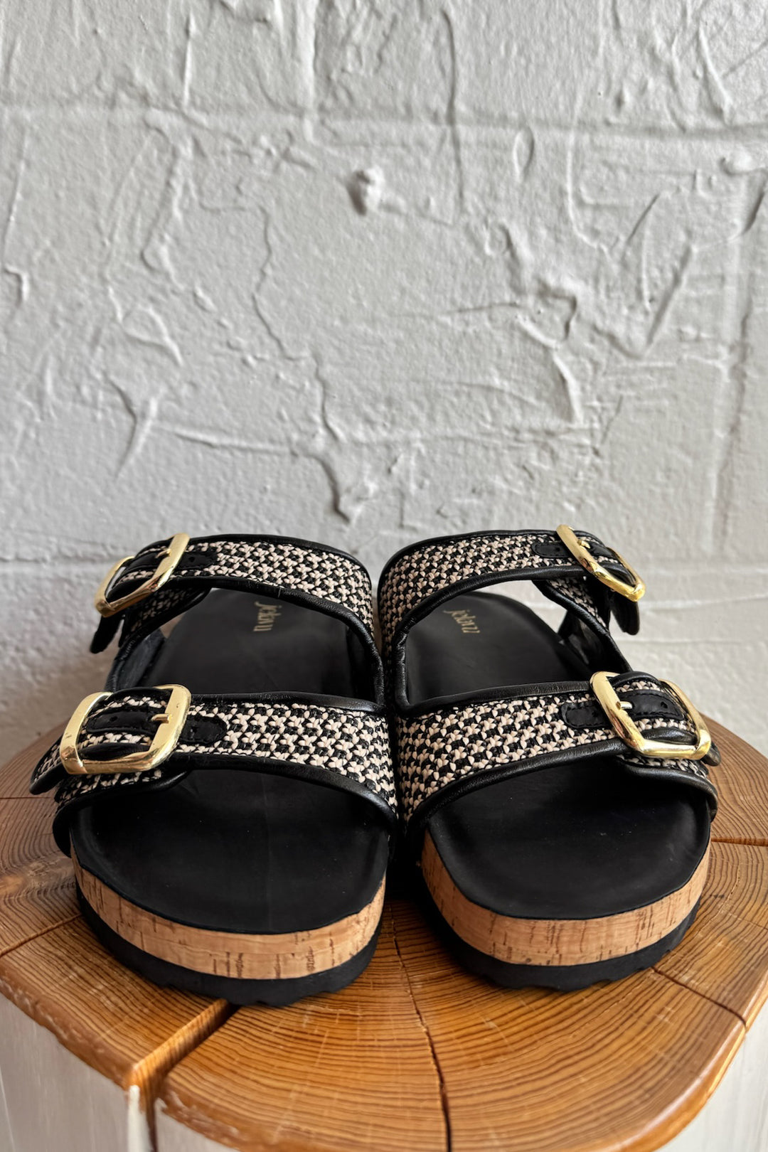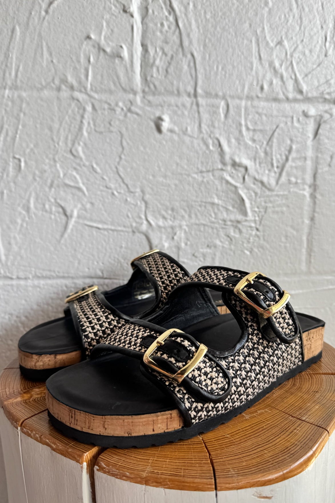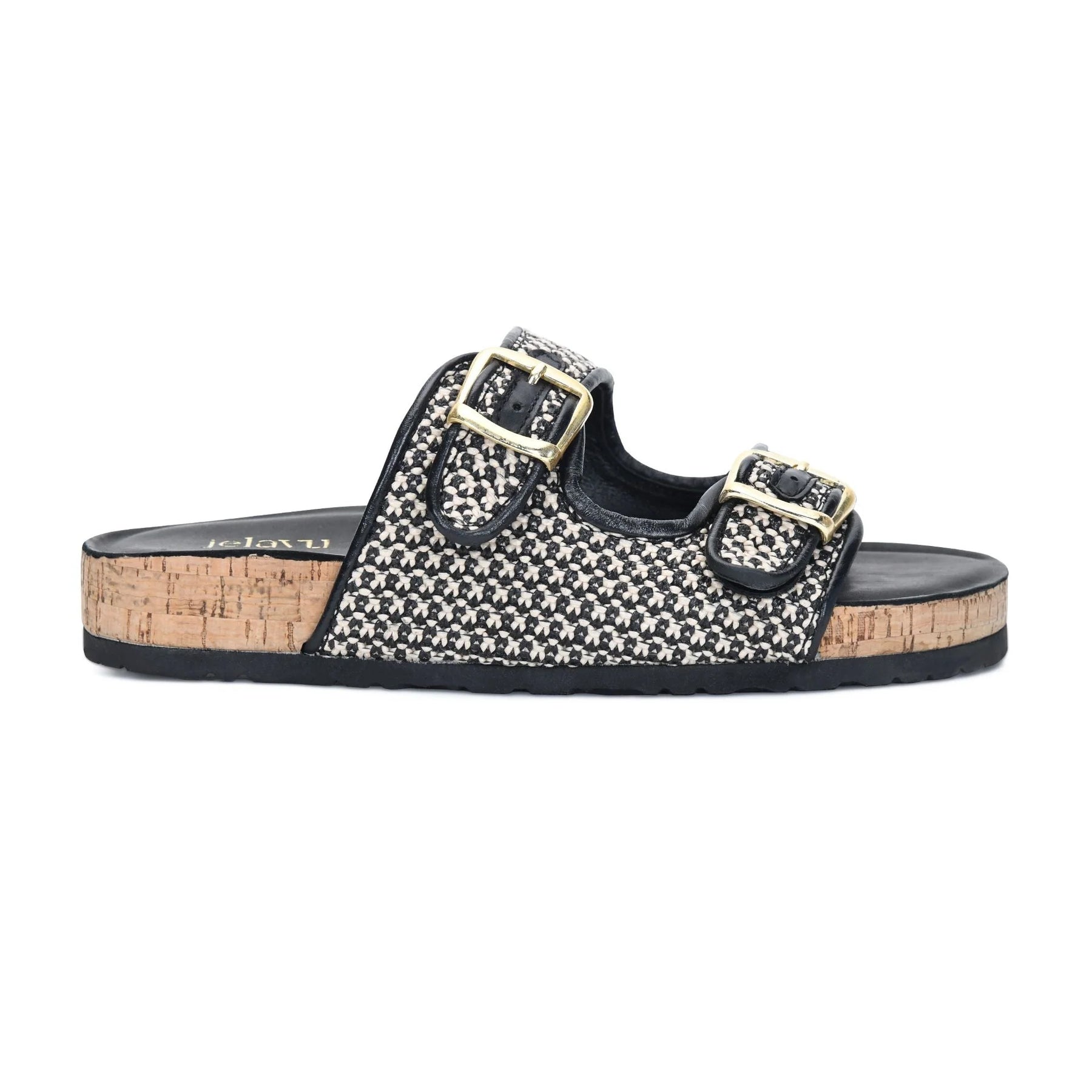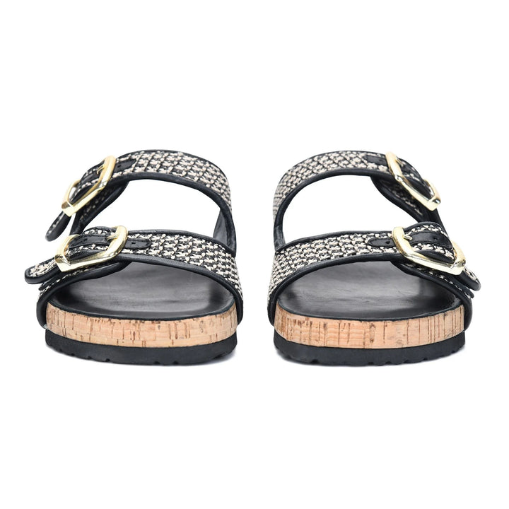 Comfort meets contrast in this elevated everyday sandal. The Marbella Slide features a genuine leather upper and black-and-white woven straps, accented with gleaming gold-tone buckles for a touch of polish. An 8mm memory foam footbed and cork-inspired platform sole deliver all-day cushioning and effortless style—from coffee runs to weekend getaways.