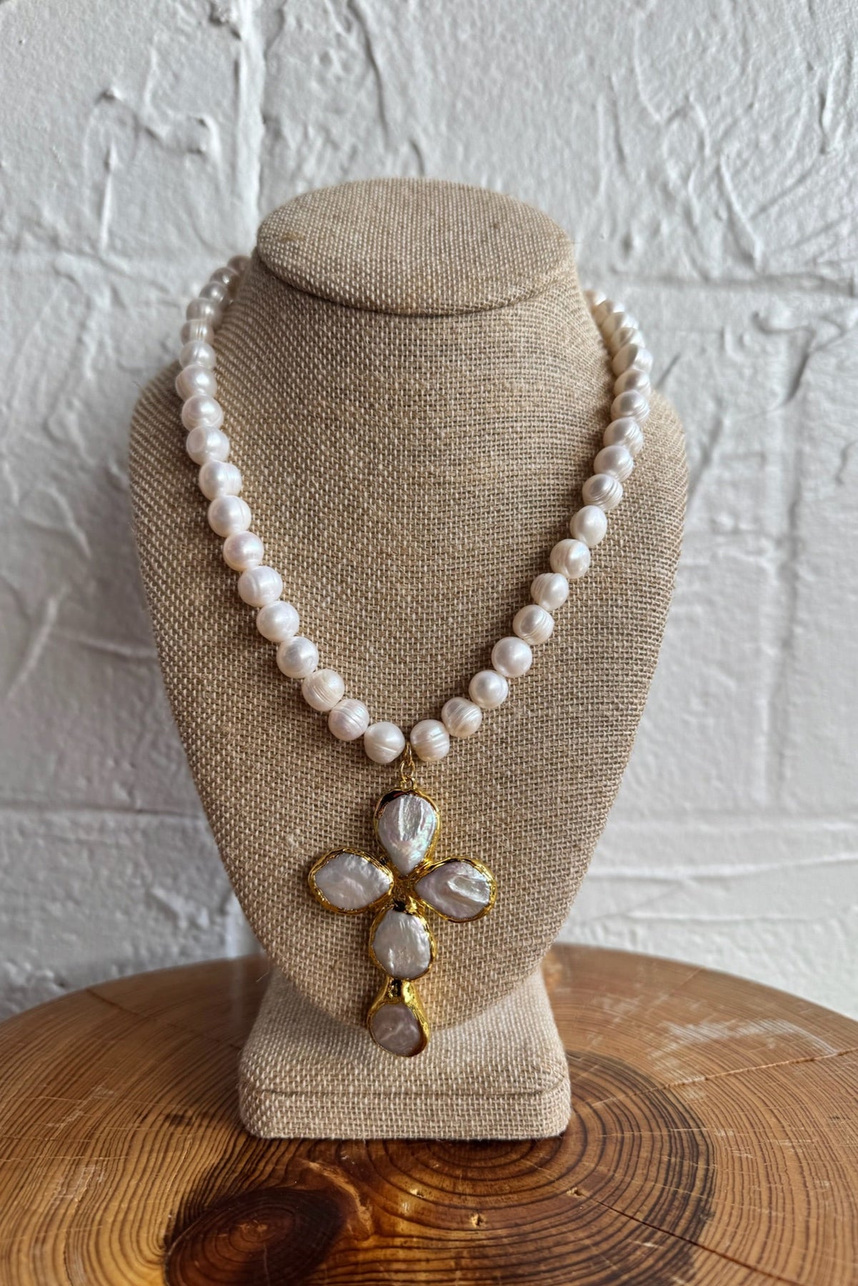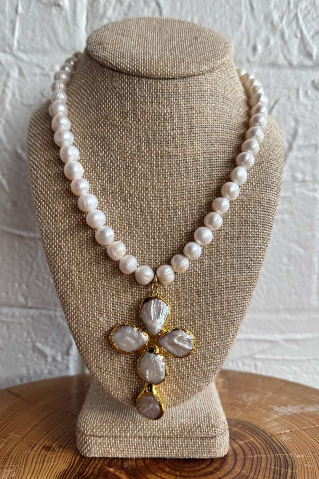 An elegant nod to heirloom style with a modern twist. This standout piece by Virtue Jewelry features a jumbo freshwater pearl cross framed in radiant gold, suspended on a strand of luminous potato pearls. Equal parts refined and bold, it’s a piece made to turn heads and spark conversation.