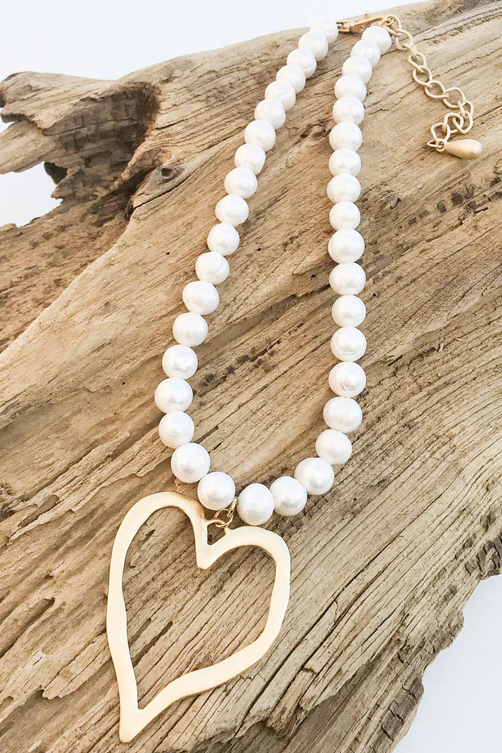 Big-hearted and bold, this showstopper necklace blends classic pearls with a statement twist. The Jumbo Heart on Potato Pearls in White/Gold features luminous hand-strung pearls and an oversized heart pendant in a brushed gold finish. Feminine, playful, and unapologetically chic—it’s made to turn heads and spark conversation.