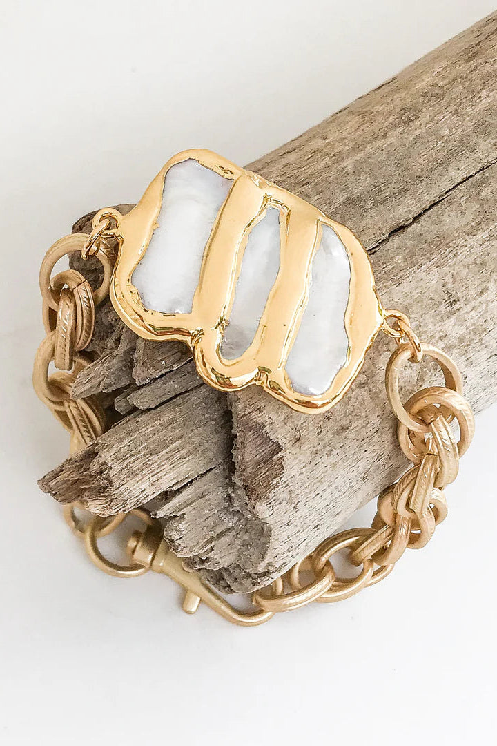 Designed to turn heads, the Belle Bracelet in Pearl brings artful edge to your arm stack. A sculptural baroque pearl centerpiece is trimmed in luxe gold and paired with a chunky textured chain. It's bold, refined, and surprisingly easy to style.